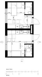 Som framgår av ritningen tänker sig byggaren att skapa ett slags parhus, där två lägenheter om vardera 16 kvm byggs i en gemensam huskropp. Det sparar en yttervägg, det underlättar dragning av vatten och avlopp, eldragnng för kyl och frys och fler detaljer.
